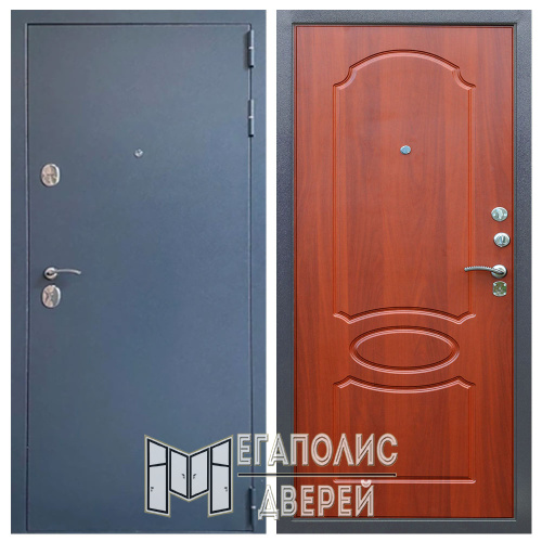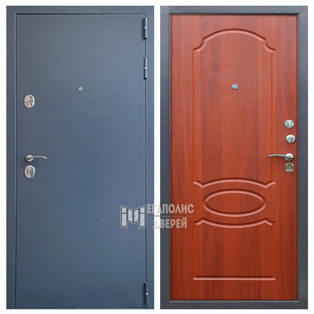 Дверь изготовлена из стали и имеет два замка Гардиан 4 класса взломостойкости, а также ночную задвижку. Два уплотнительных контура и базальтовая плита в качестве наполнителя обеспечивают достаточно высокий уровень шумоизоляции. С внешней стороны дверь окрашена в темный цвет «7024». А цвет внутренней стороны вы можете выбрать в зависимости от интерьера вашей квартиры – Сандал белый или итальянский орех.