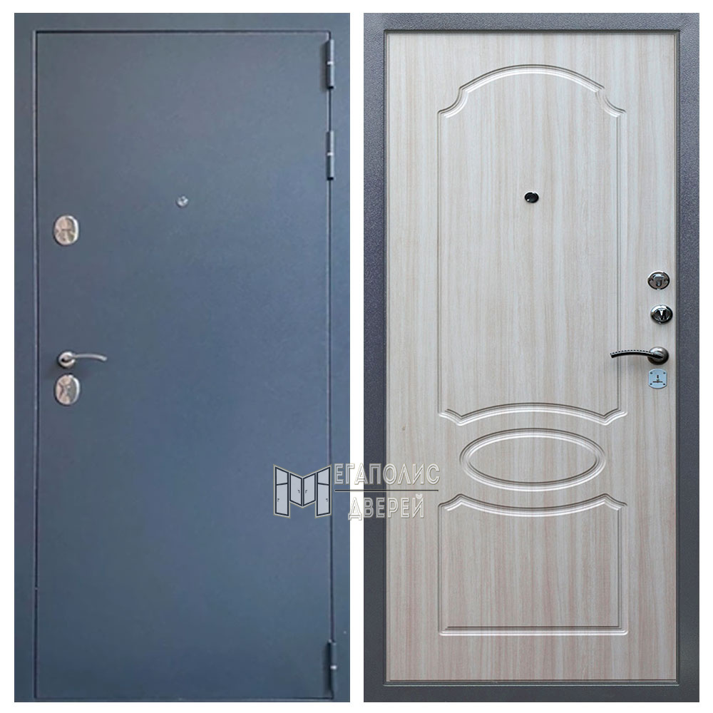 Дверь изготовлена из стали и имеет два замка Гардиан 4 класса взломостойкости, а также ночную задвижку. Два уплотнительных контура и базальтовая плита в качестве наполнителя обеспечивают достаточно высокий уровень шумоизоляции. С внешней стороны дверь окрашена в темный цвет «7024». А цвет внутренней стороны вы можете выбрать в зависимости от интерьера вашей квартиры – Сандал белый или итальянский орех.