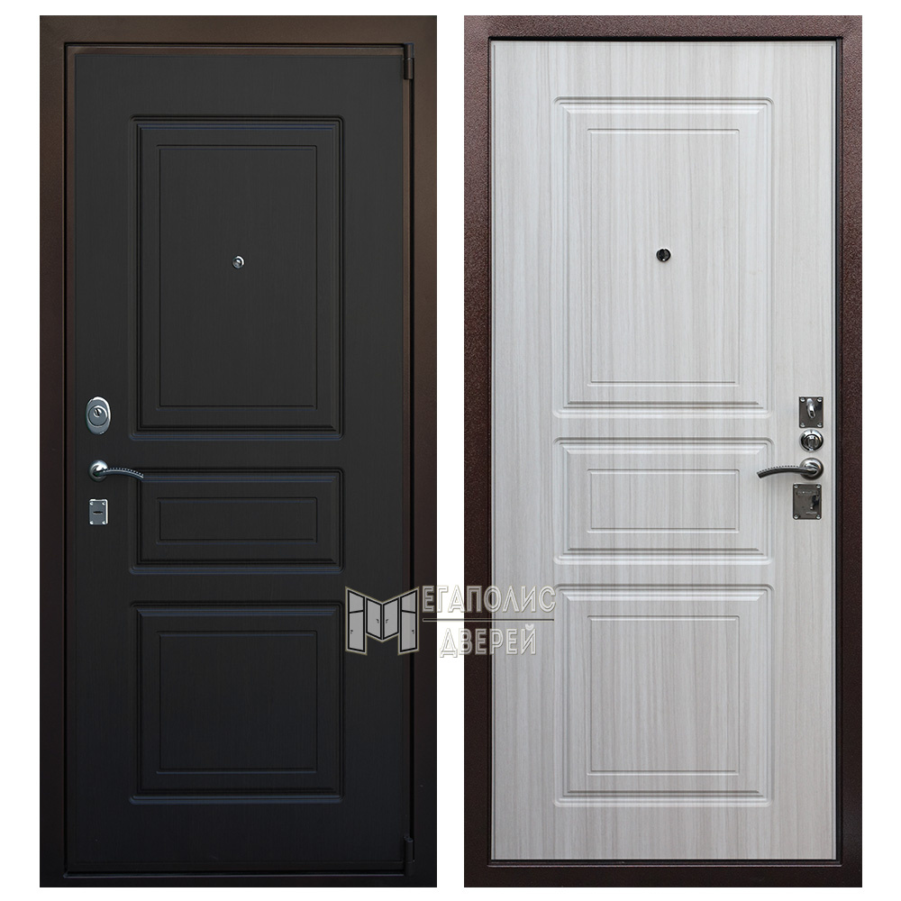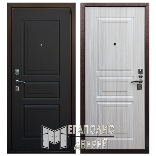 За безопасность отвечают взломостойкие замки известной марки «Гардиан», также имеется дополнительная ночная защёлка «вертушок». Дизайн в виде филёнок с обеих сторон полотна идеально дополнит интерьер, выдержанный в сдержанном современном стиле.