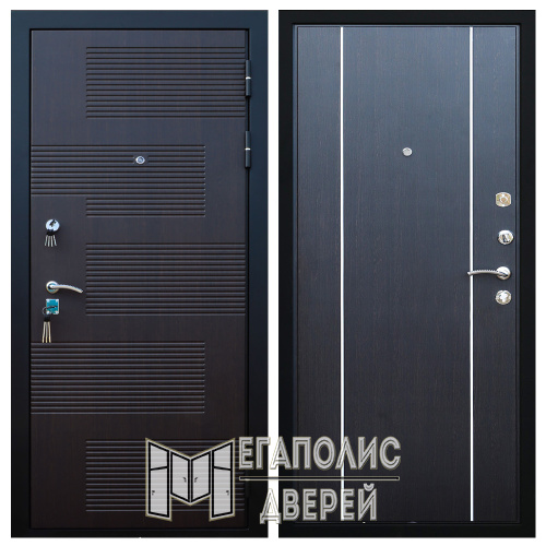 Входная металлическая дверь «Броня Т1» отличается необычным дизайном: наружная сторона полотна цвета «венге» декорирована горизонтальным фрезерованным орнаментом, расположенным в шахматном порядке; изнутри, в зависимости от дизайна входной зоны, можно выбрать один из двух контрастных оттенков – «белый дуб» или «венге» с лаконичными вертикальными молдингами.